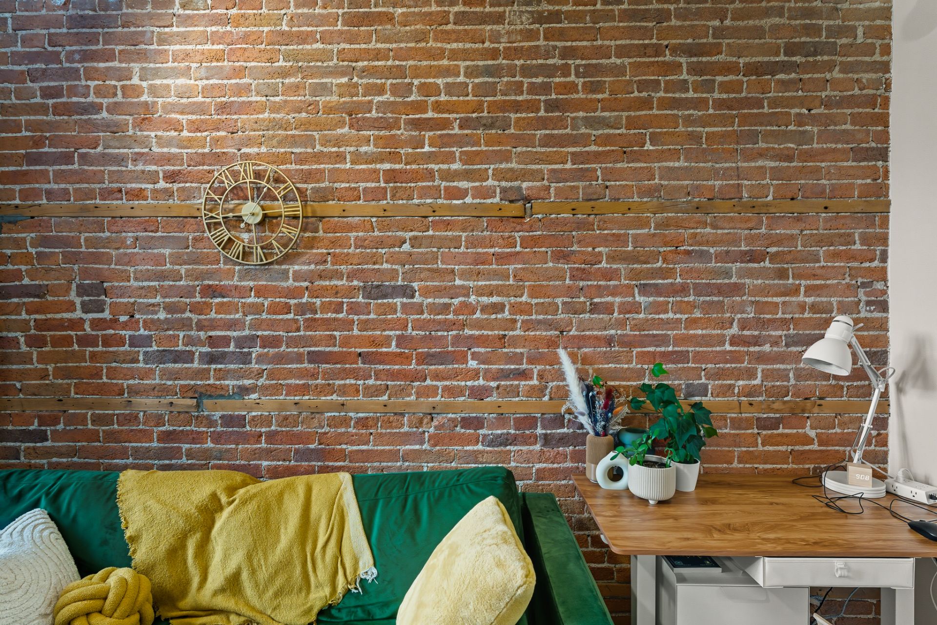 Inside, the space impresses with authentic architectural details: exposed brick and stone walls, soaring ceilings, and oversized windows that flood the unit with natural light. The flexible open layout allows for a spacious living room, a dedicated dining area, and a well-proportioned kitchen--perfect for entertaining or inspiring a creative work environment.