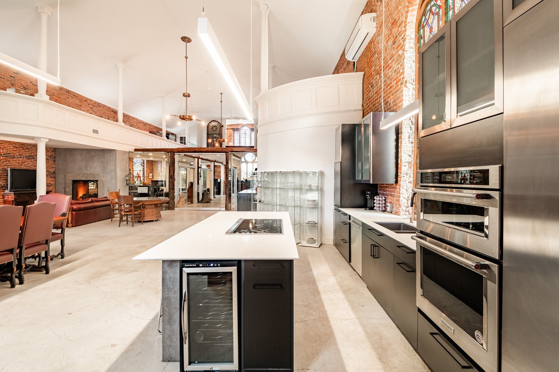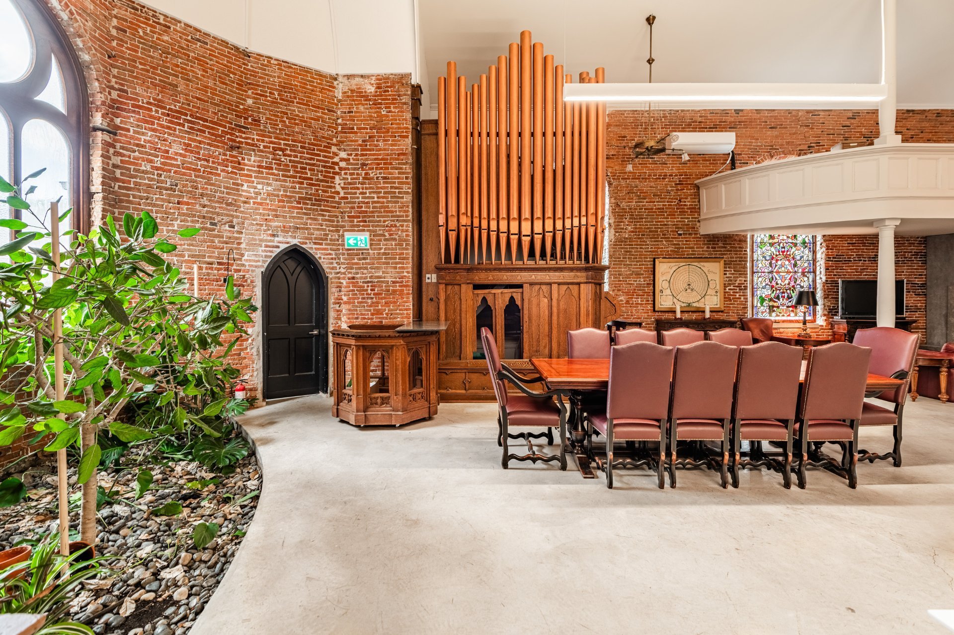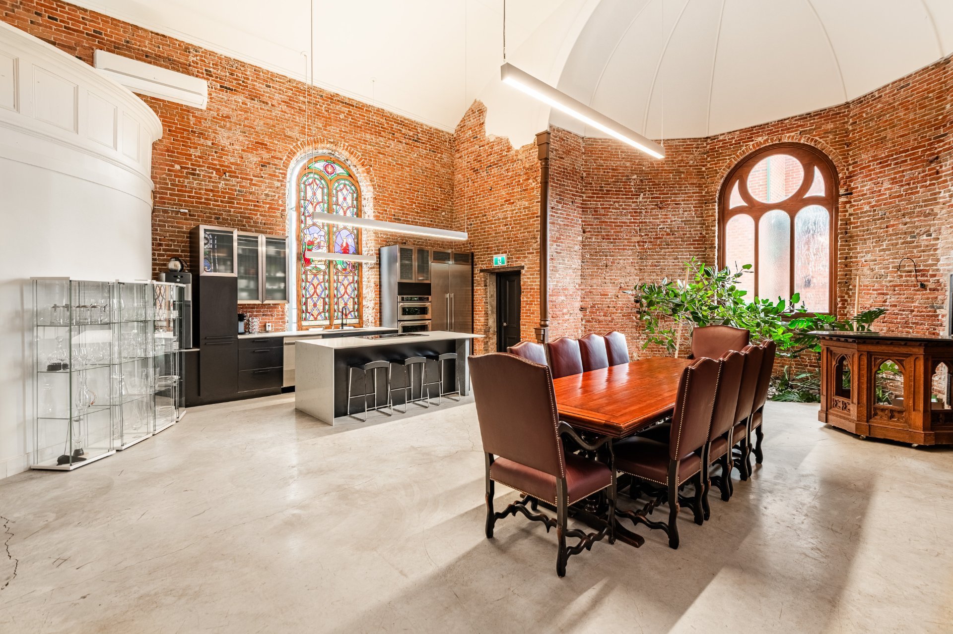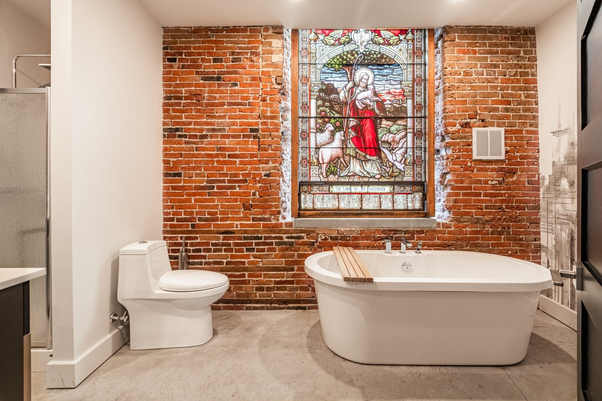 Unique and full of character, this carefully converted former church offers a truly exceptional space in a historic neighborhood. Original features--exposed brick, stained glass windows, 22 feets cathedral ceilings--create a spectacular atmosphere, while the thoughtful renovations bring modern comfort throughout. Currently used as a workspace, it includes a large open area, several glass-enclosed offices, a mezzanine, a full bathroom, and a high-end kitchen. An inspiring setting, perfect for a creative or professional project in a one-of-a-kind environment.