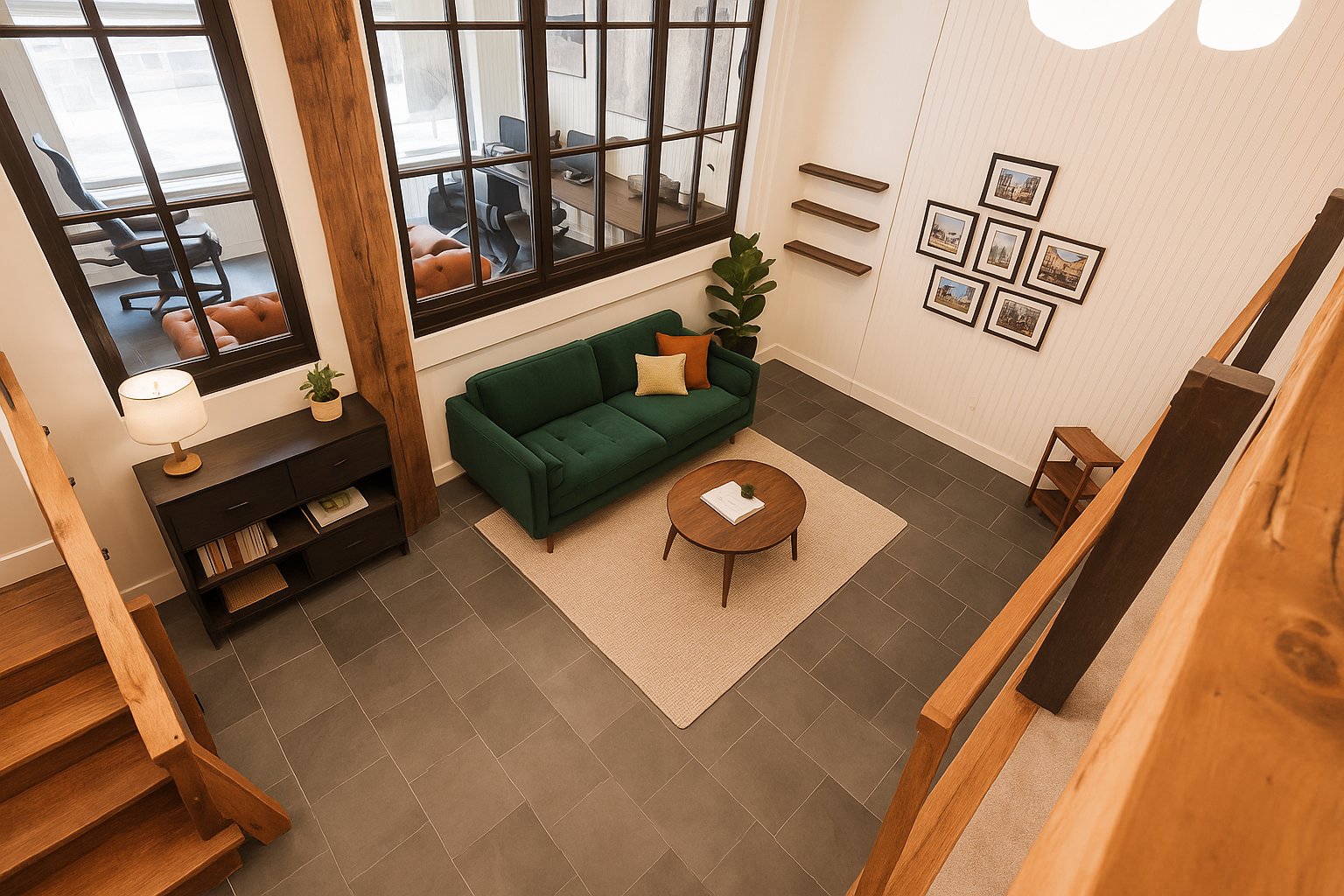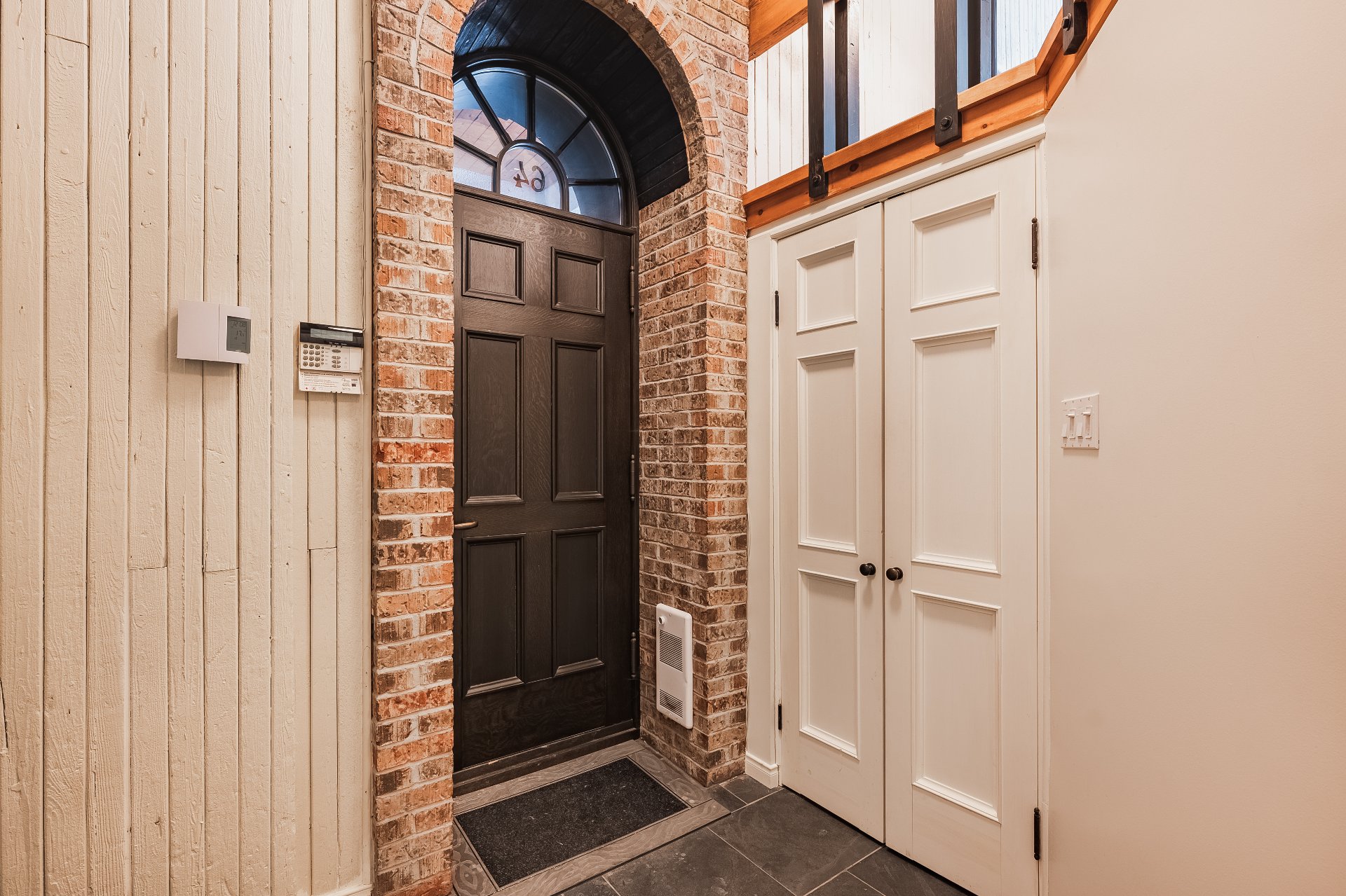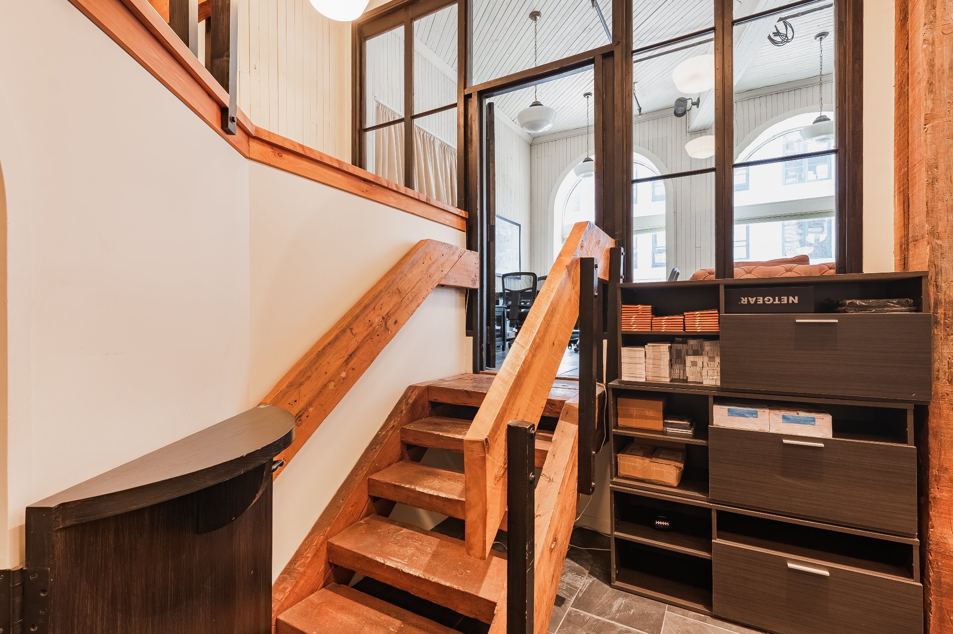 Natural materials blend seamlessly with the building's unique architecture: floating staircase with massive steps, slate flooring, oak front door, imported English hardware, and soaring ceilings with exposed beams.