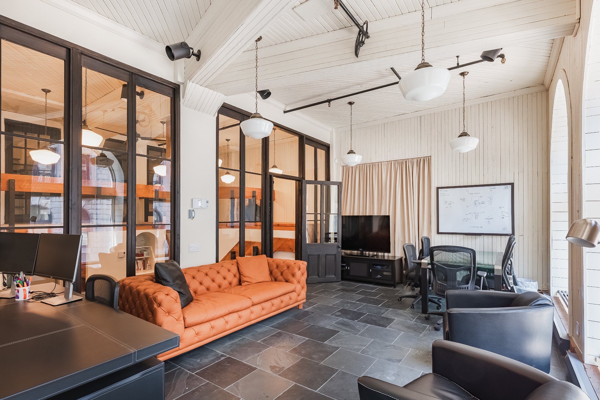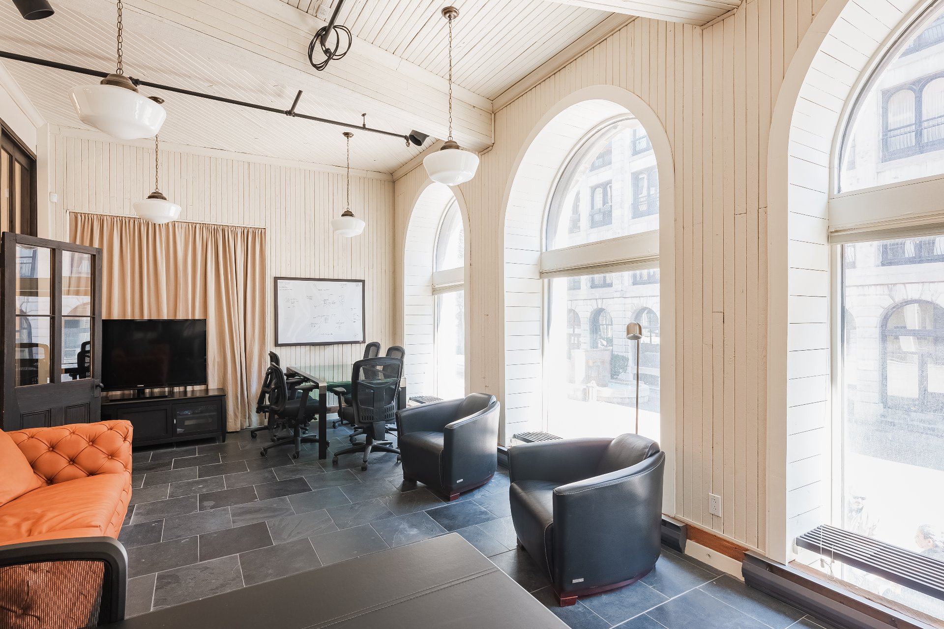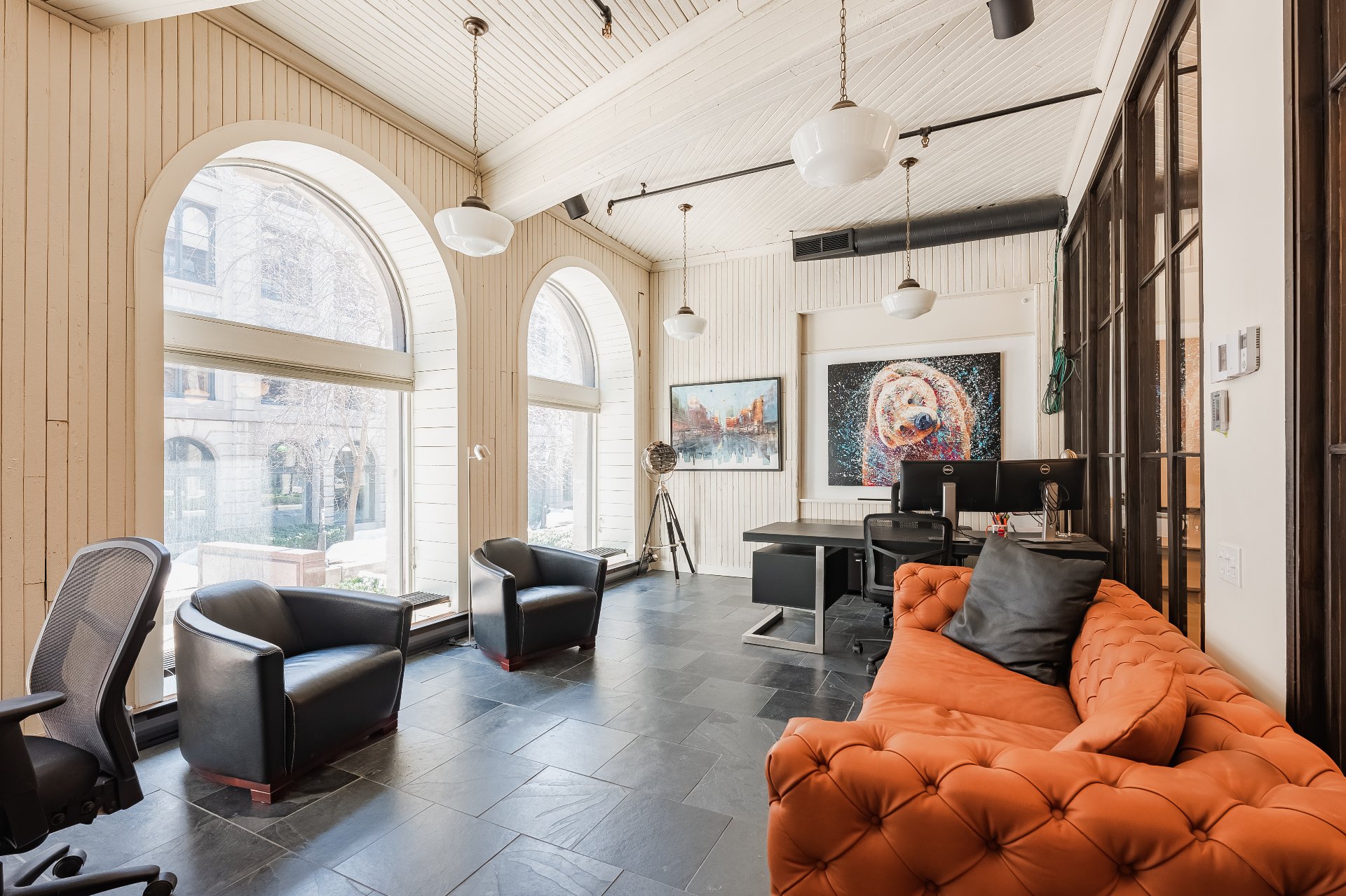 Experience your luxury in 2025! Prestigious office spaces available in Les Cours Le Royer, a historic building located in the heart of Old Montreal. Access to the unit is through a private ground-floor entrance. The space features a fully equipped kitchen, tall arched windows overlooking the fountains of a peaceful interior courtyard, while the bells of the Notre-Dame Basilica ring in the morning. It feels like living in Paris.
