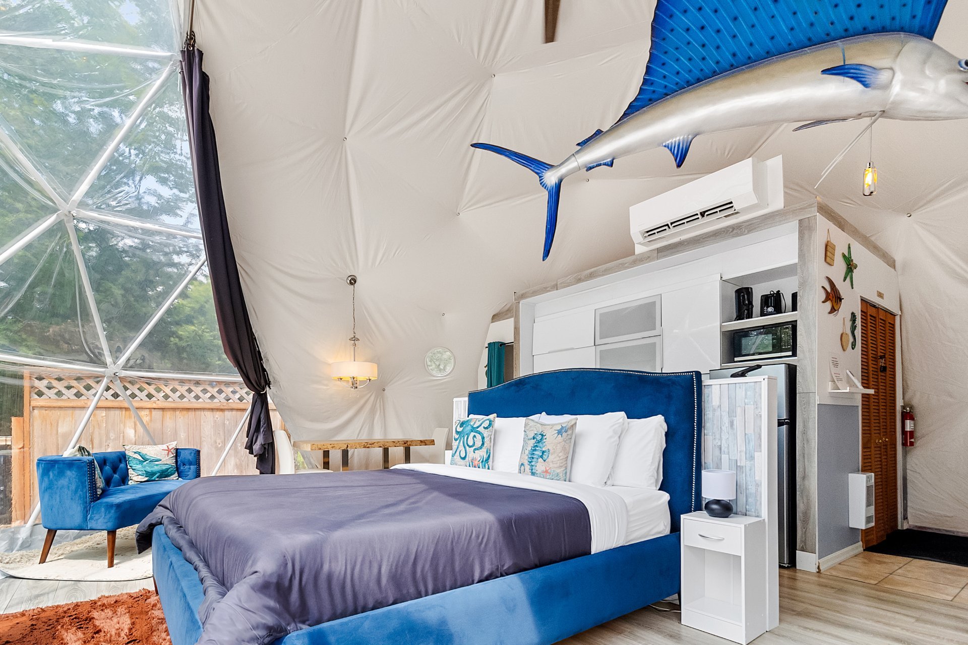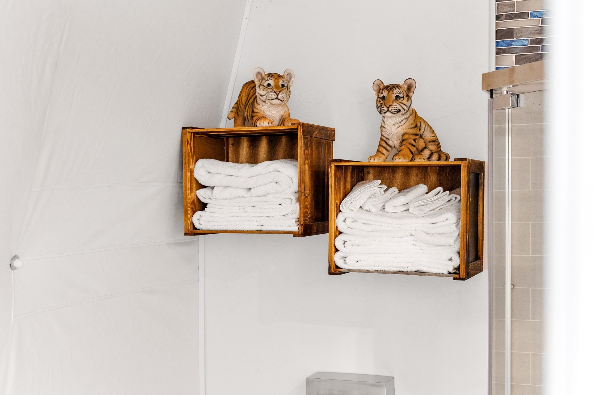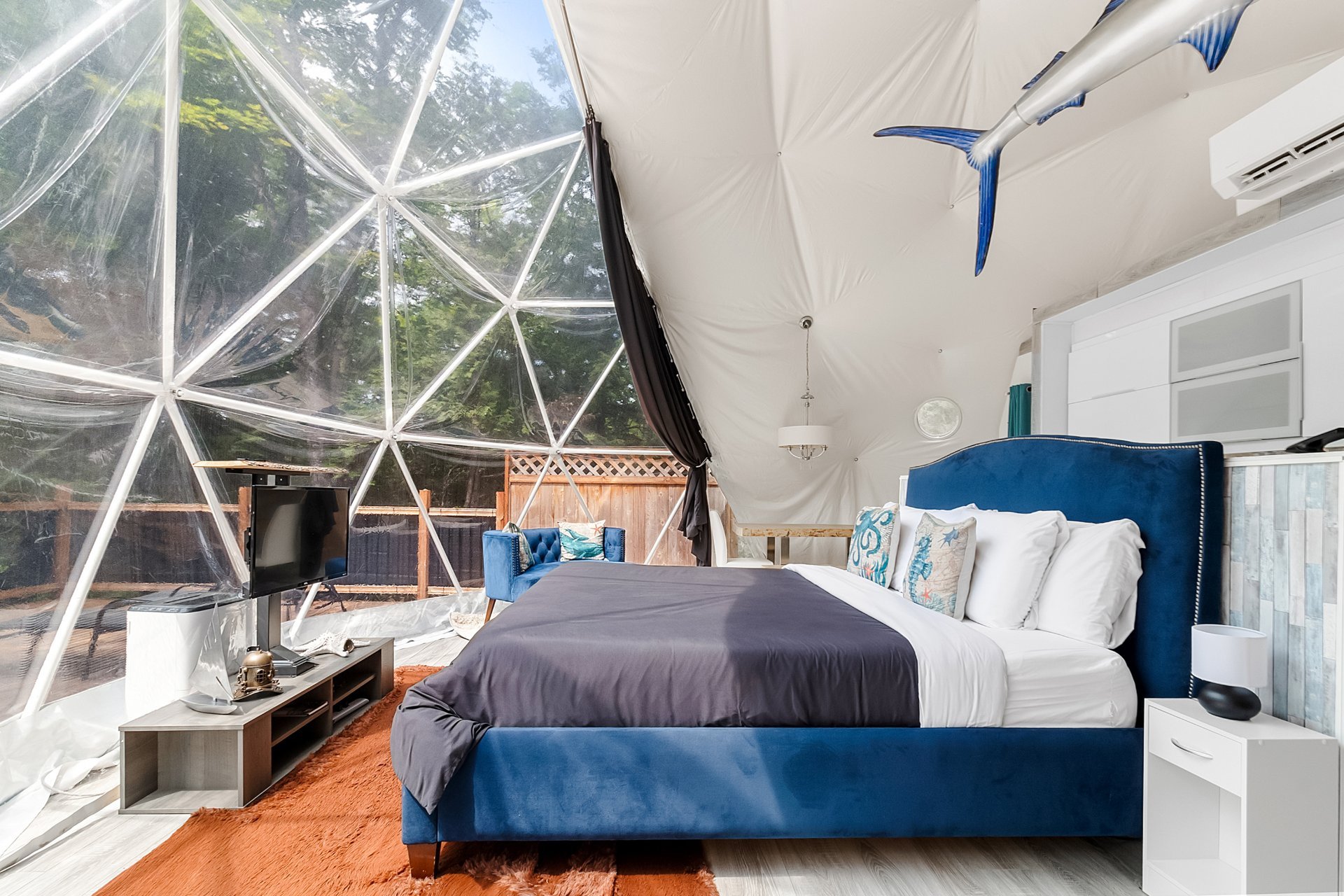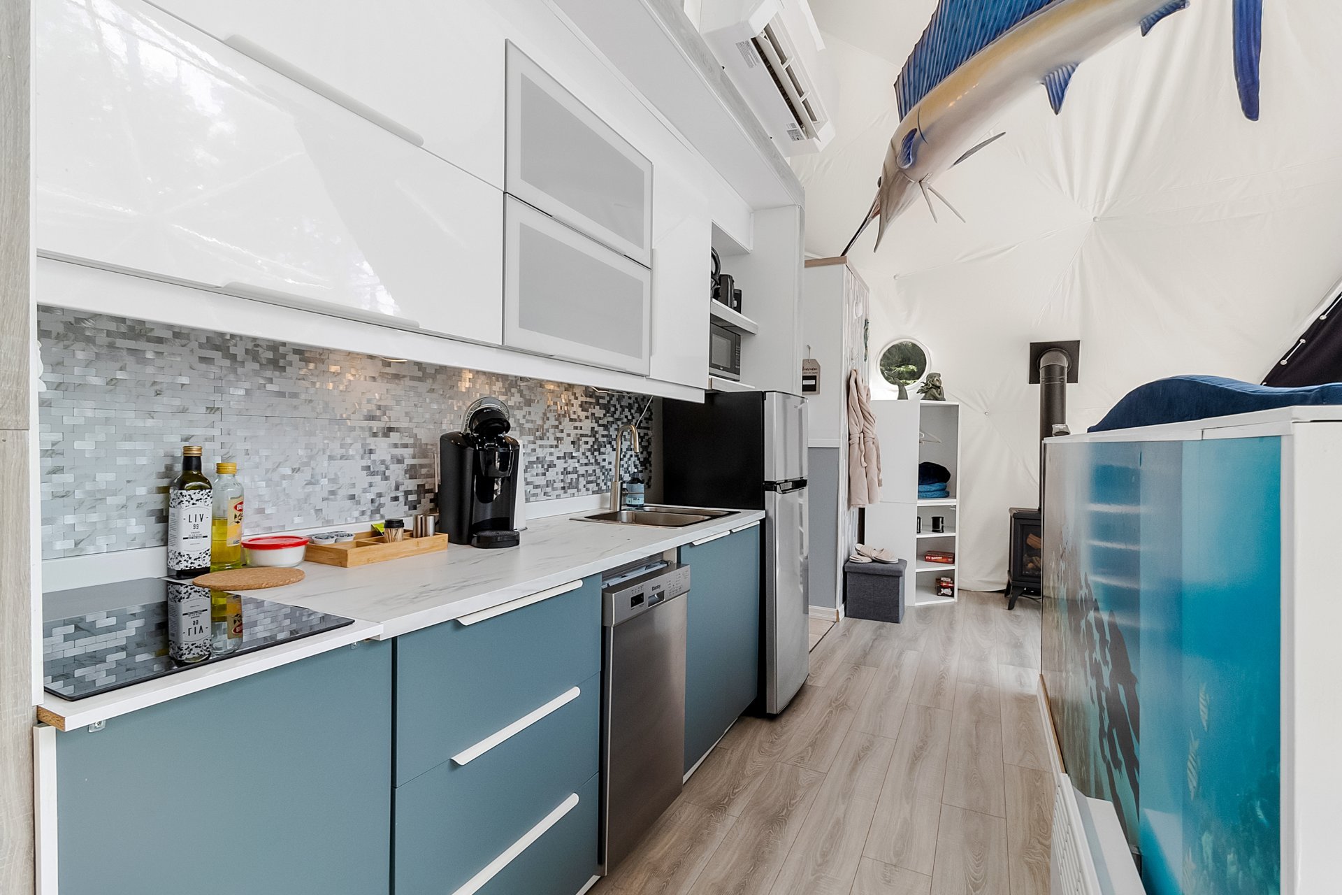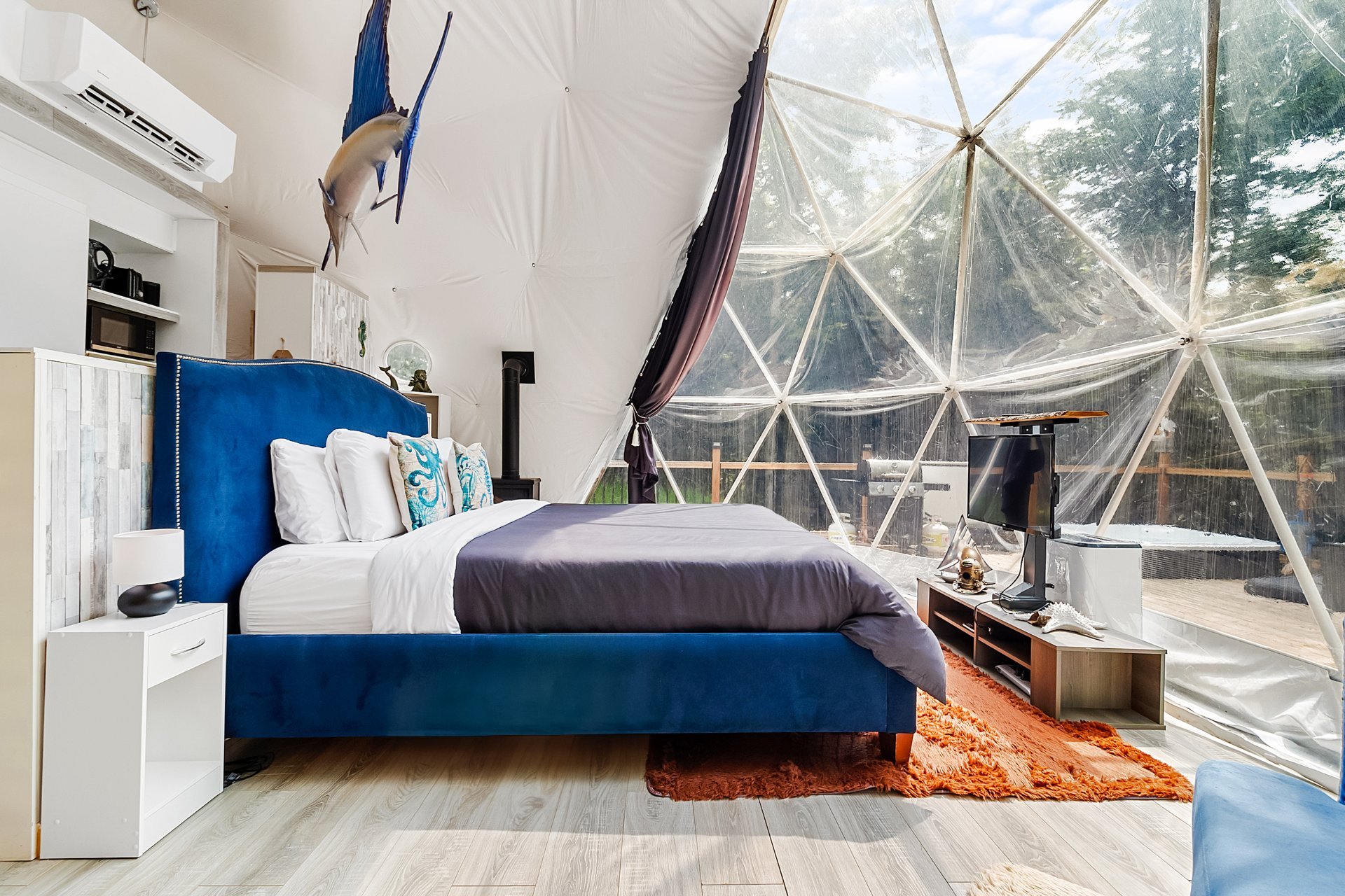 - All the furniture and accessories in the chalets, the spa, the outdoor tables & dock.