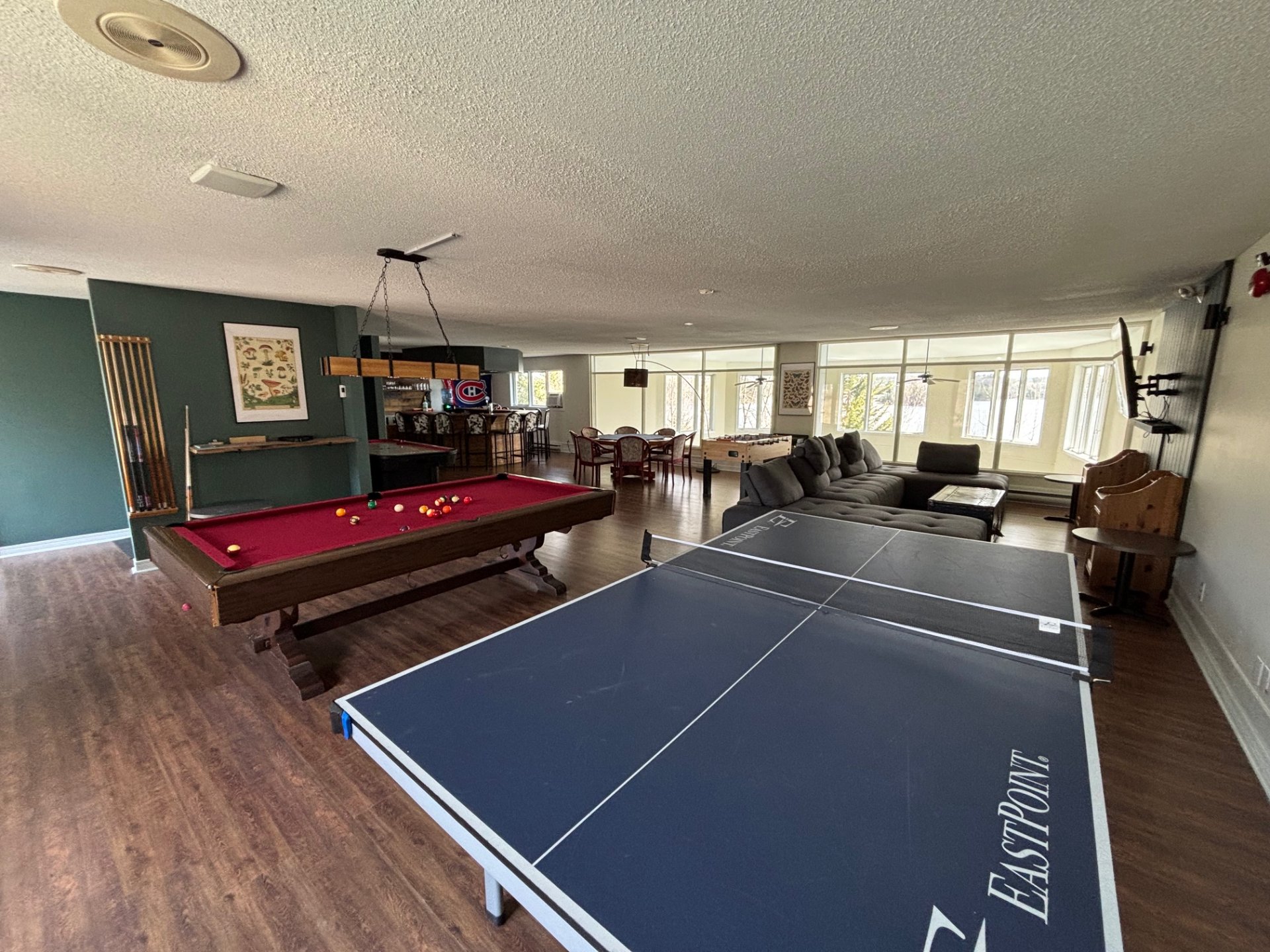 Salle de séjour commune avec salon, billard, jeux de société, babyfoot, air hockey, bar, écran géant...