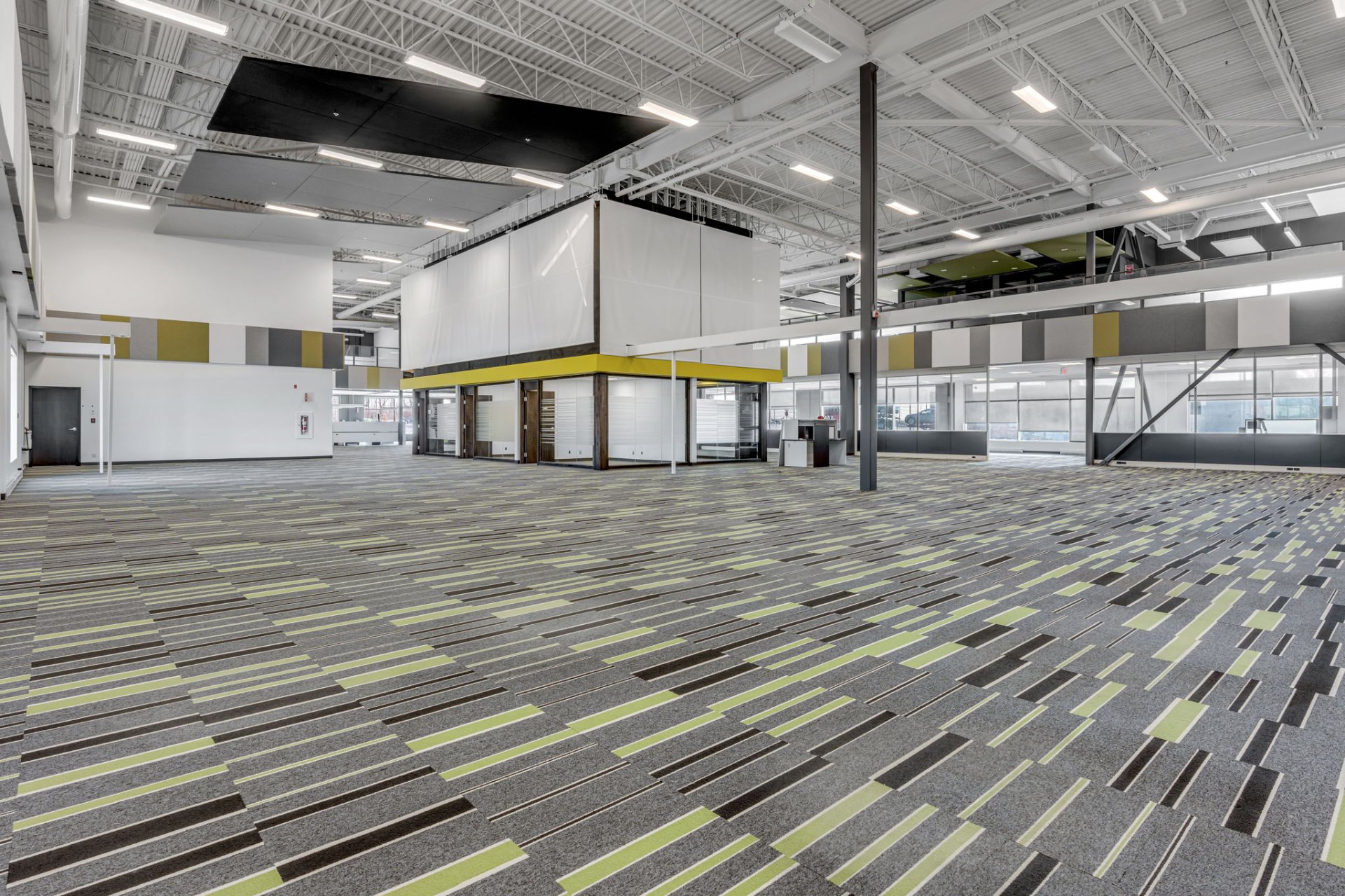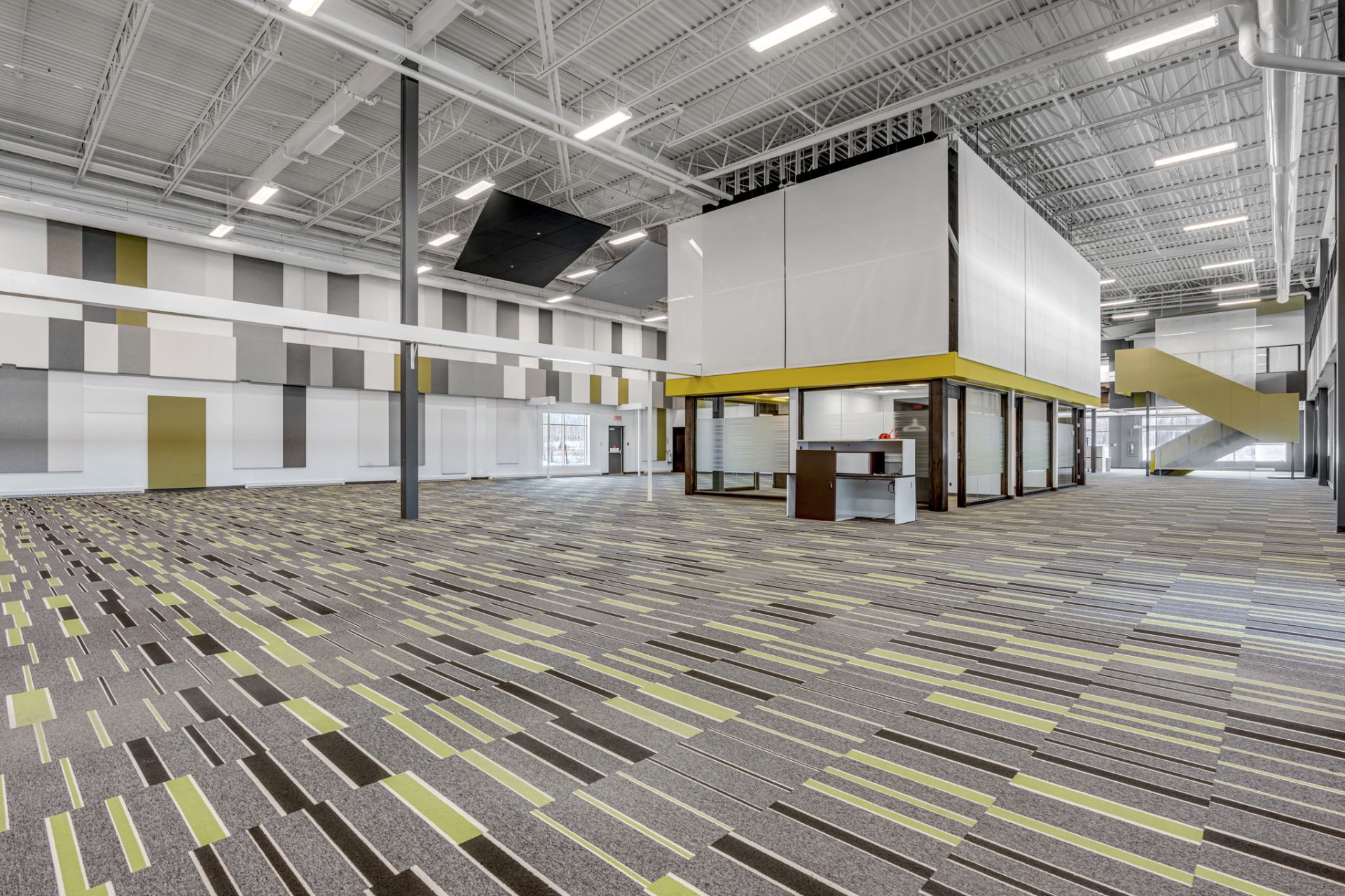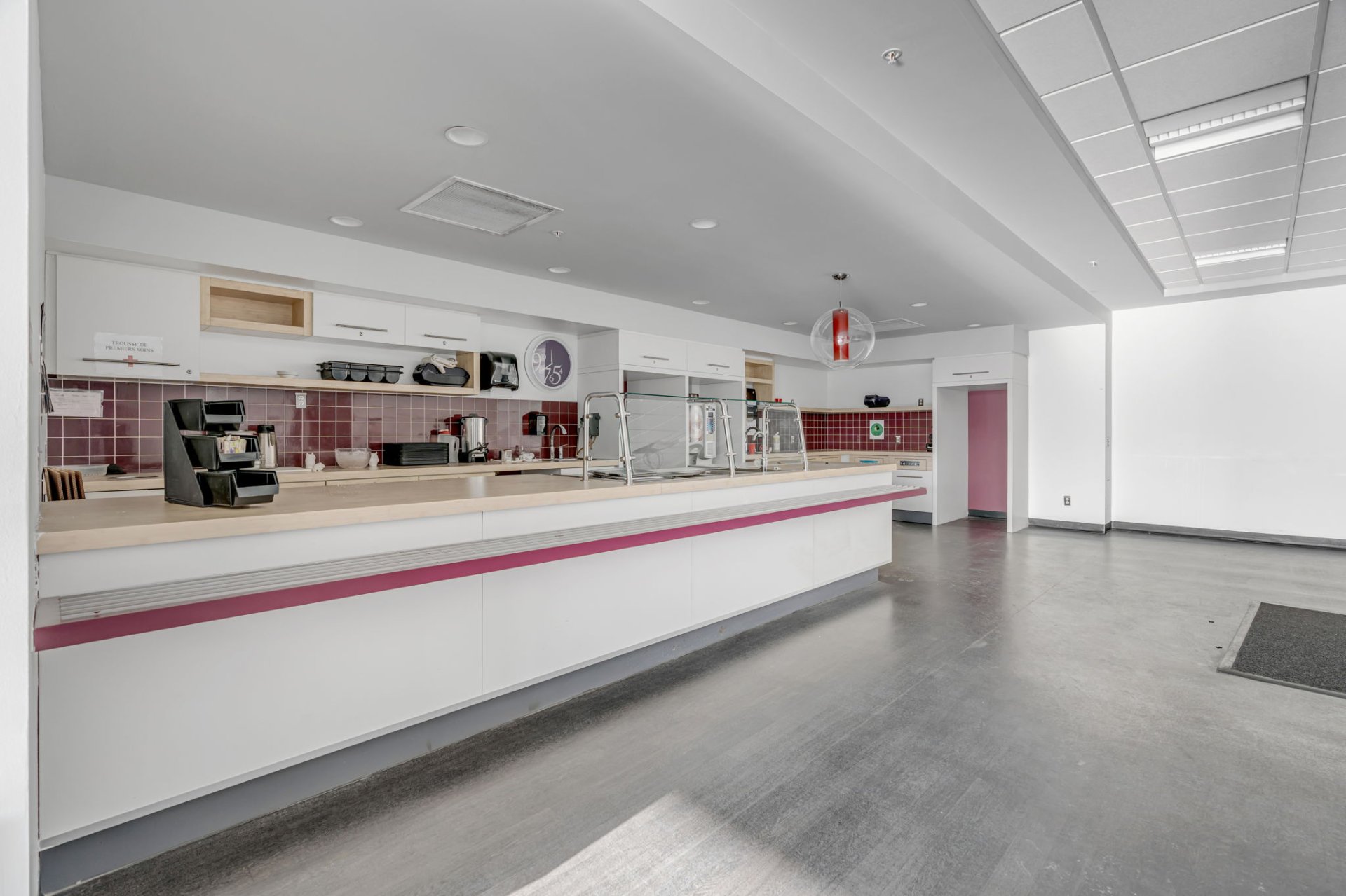 Espace aménagé pour cuisine, salle à manger et salle de repos.