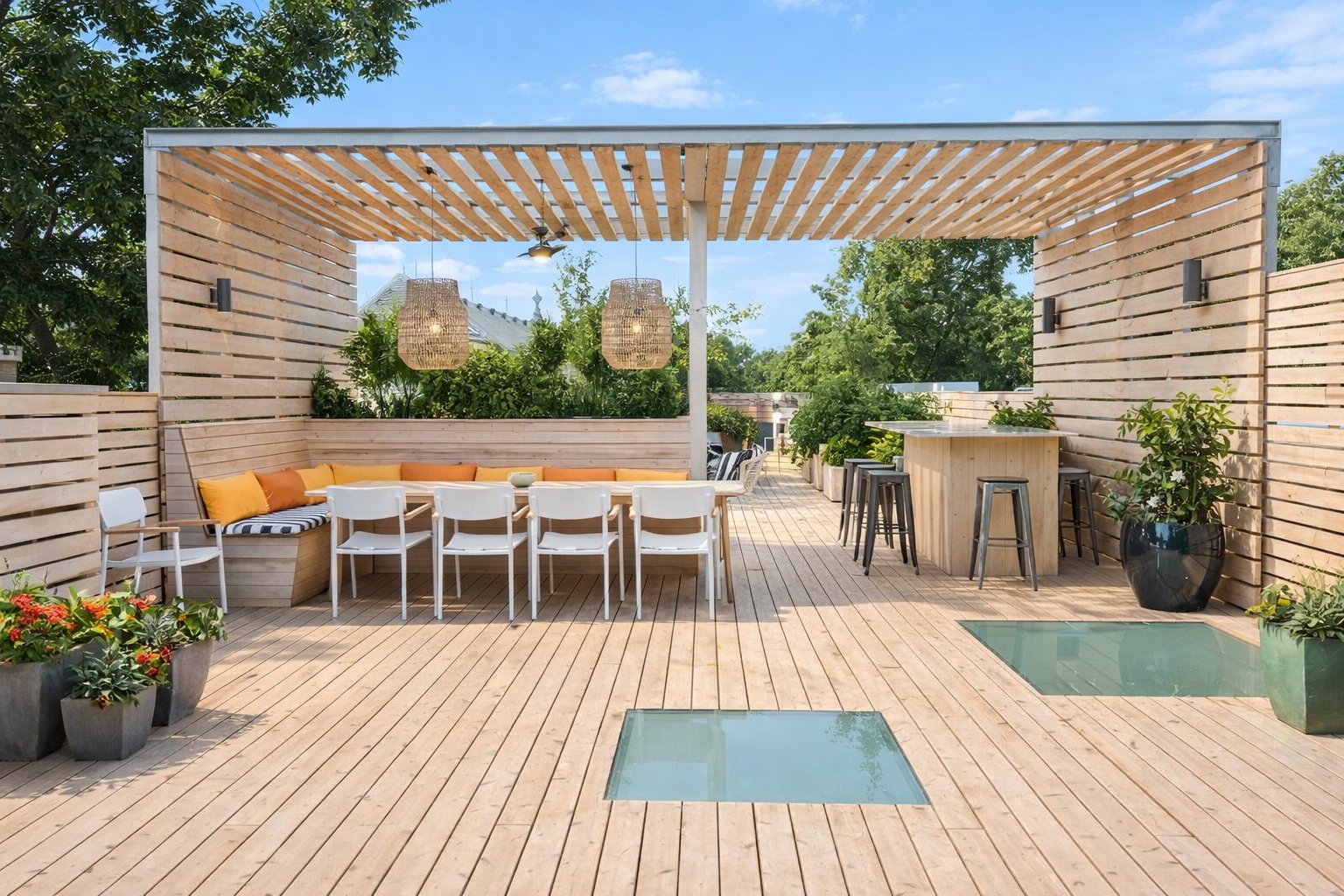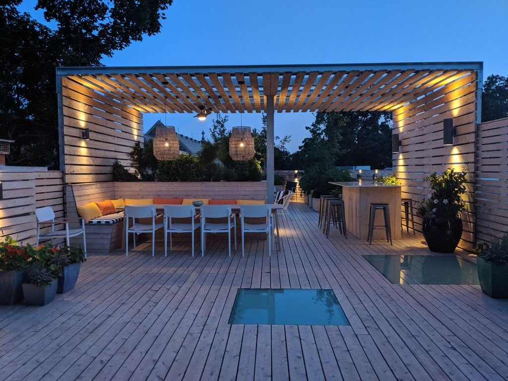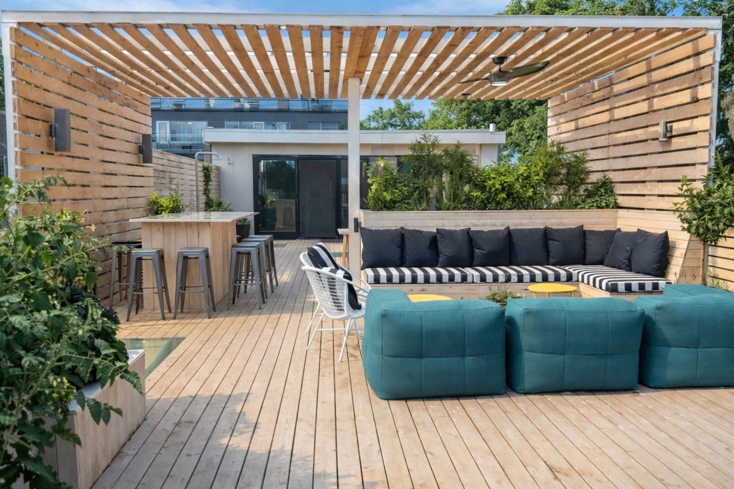 pergola, le mobilier et les coussins de terrasse et borne pour voiture électrique extérieure.